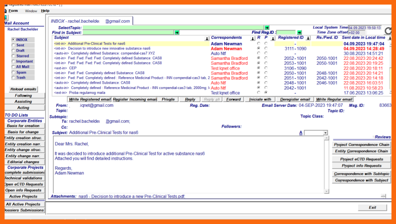 During the insertion of the record into the eCTD Integrated Information System a core sequence and a directory tree of replacement narrative files are generated and the newly defined Pre-Clinical Tests automatically becomes the topic of the "basis for creation" enriched email and all selected previously received enriched emails. That can be seen when inserting additional data on the "correspondence" sub-application form.