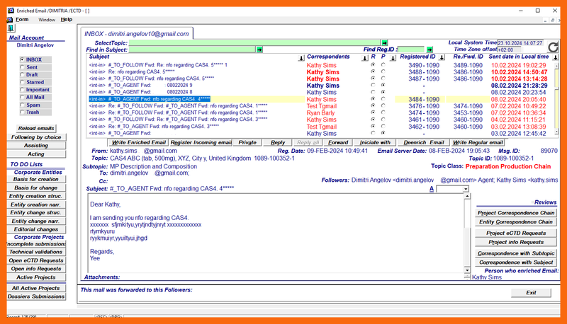 Since the Enriched Email Client is by its nature in "real-time" and is used for interactive monitoring of the main activities on the creation and development/change of Corporate Entities and realization of Corporate Projects, it thus sets the whole eCTD Integrated Information System in real "real-time". All activities and events are in real-time, appear chronologically related in reviews and reports, and do not depend on the time of data entry into various Excel "share points".