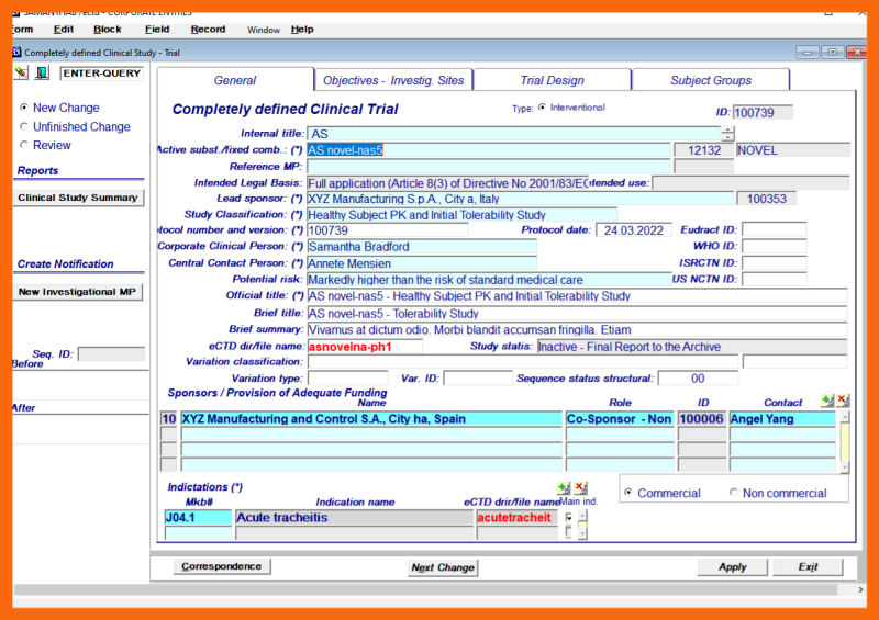 Changes to the Clinical Trial entity begin with structural changes on the application form "Corporate Entity change/Clinical Trial/structural data" based on one or more "basis for change" documents generated within the Pharmaceutical Corporation itself or by the Business Partners and processed by the Enriched Email Client.