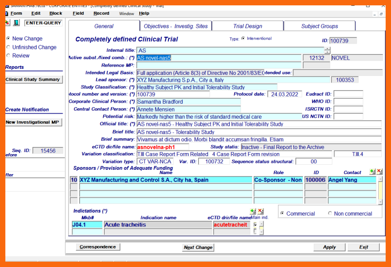 In the "New Change" mode of the application form using the LoV of Clinical Trials ready for change, with one or more unused "basic for change" emails, the selection of entity to be processed and structurally changed is performed. The logged-in person's roles as a designated follower, Assistant, and Agent are used as a filter to display a LoV of entities with upcoming changes.