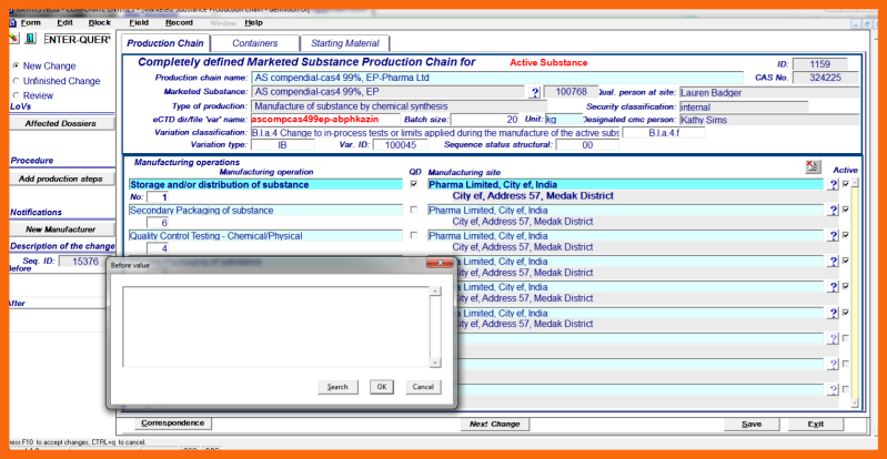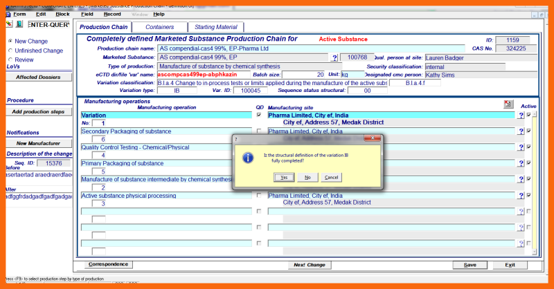Using the dialog on the sub-application form "Correspondence" and received "basis for change" emails with attached "basis for change" documents, the designated cmc entity person, his Assistant, or his Agent must determine the appropriate Variation type and start the structural definition of the change to the Marketed Substance - Production Chain entity.