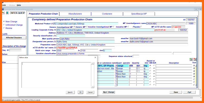 Changes to the Medicinal Product - Preparation Production Chain entity begin with structural changes on the application form "Corporate Entity change/Preparation Production Chain/structural data" based on one or more "basis for change" documents generated within the Pharmaceutical Corporation itself or by the Business Partners and processed by the Enriched Email Client.