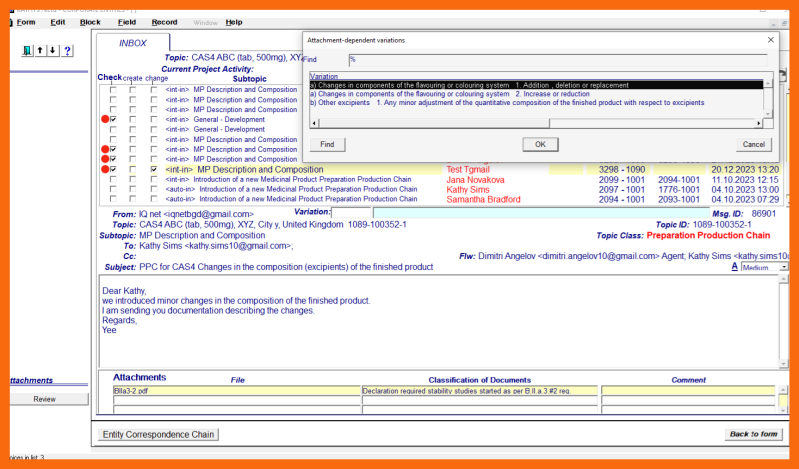 Using the dialog on the sub-application form "Correspondence" and received "basis for change" emails with attached "basis for change" documents, the designated cmc entity person, his Assistant, or his Agent must determine the appropriate Variation type and start the structural definition of the change to the Medicinal Product - Preparation Production Chain entity.