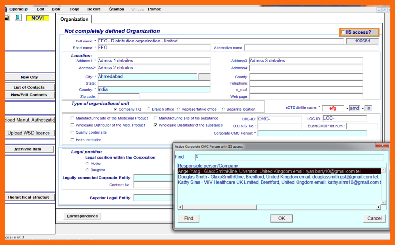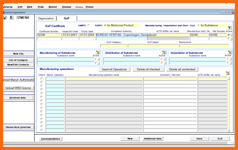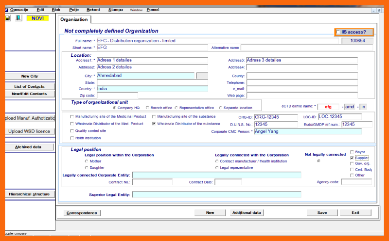 - free text fields for "ORG-ID", "LOC-ID", "D.U.N.S. No.", and "Eudra GMDP"