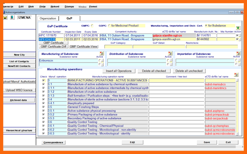 In the block "Manufacturing Operations" all operations from the "Good Manufacturing Practice Certificate" of the Organization can be selected from the LoV. These Manufacturing Operations are interrelated with the Functions/Manufacturing Operations on the application form "Medicinal Product Preparation Production Chain" which are used, among other things, to automatically fill in the eCTD electronic Application Form (eAF).