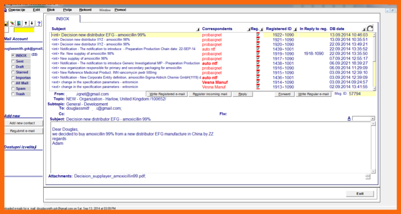 During the insertion of the record into the eCTD Integrated Information System a core sequence and a directory tree of replacement files are generated and the newly defined Organization automatically becomes the topic of the "basis for creation" enriched email and all selected previously received enriched emails.