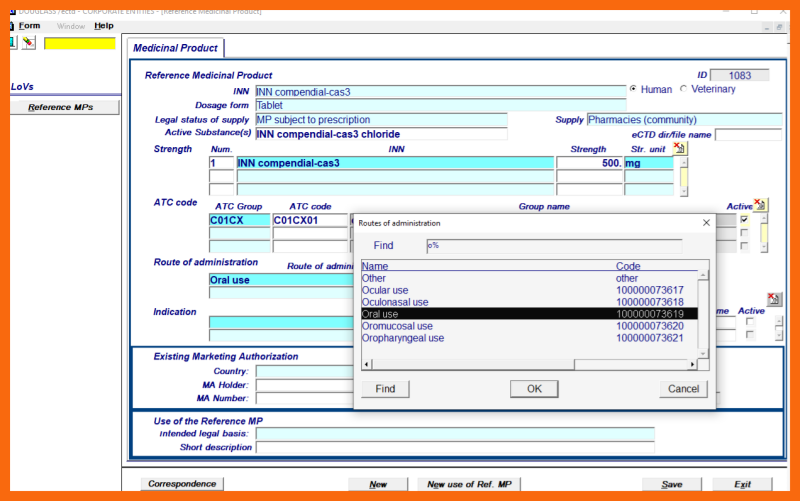 The general structural data defining Reference Medicinal Products are defined using predefined Lists of Values (LoVs) for INNs, dosage forms, units of measures, Legal status of supply, Supply, ATC codes, routes of administrations and indications.