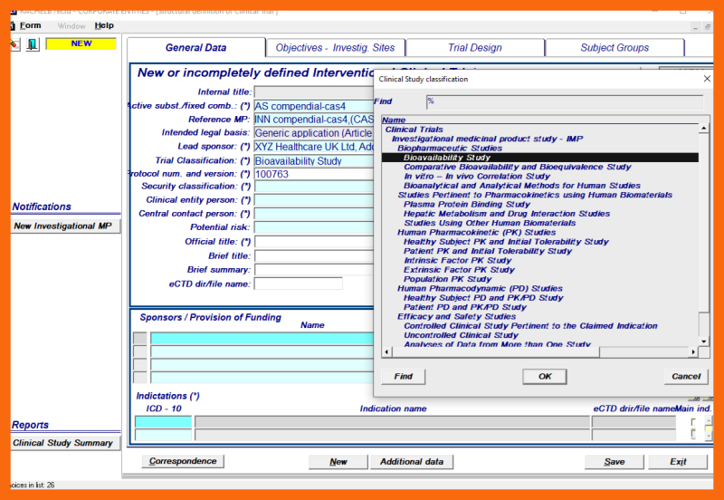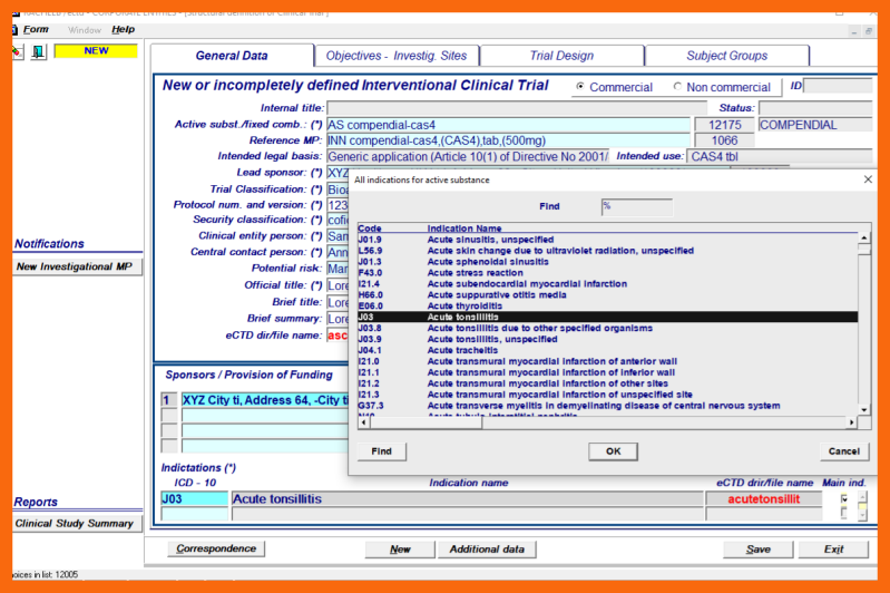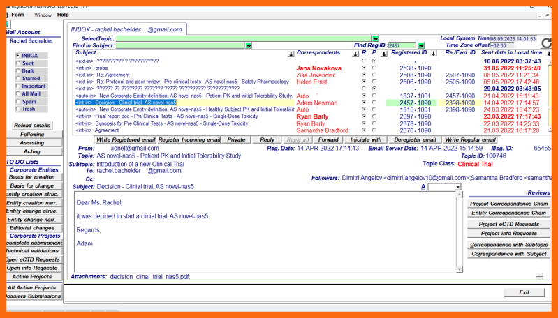 During the insertion of the record into the eCTD Integrated Information System a company core sequence and a directory tree of replacement narrative files are generated and the newly defined Clinical Trial automatically becomes the topic of the "basis for creation" enriched email and all selected previously received enriched emails. That can be seen when inserting additional data on the "correspondence" sub-application form.