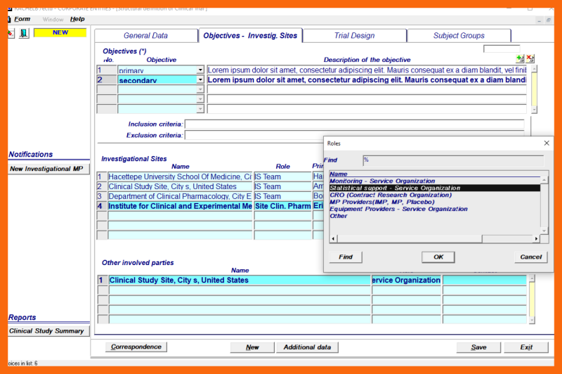 Several Investigational Sites can be selected from the LoV of Organizations of the appropriate type.