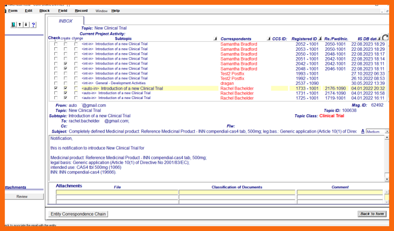 To create a new Clinical Trial, first, using the "Correspondence" sub-application form, a received "basis for creation" enriched email relevant to the new Clinical Trial being created must be selected from the non-processed correspondence documents. In addition, all enriched email messages classified as "related correspondence" pertaining to the same new Clinical Trial should also be selected in order to properly establish entity creation correspondence environment.