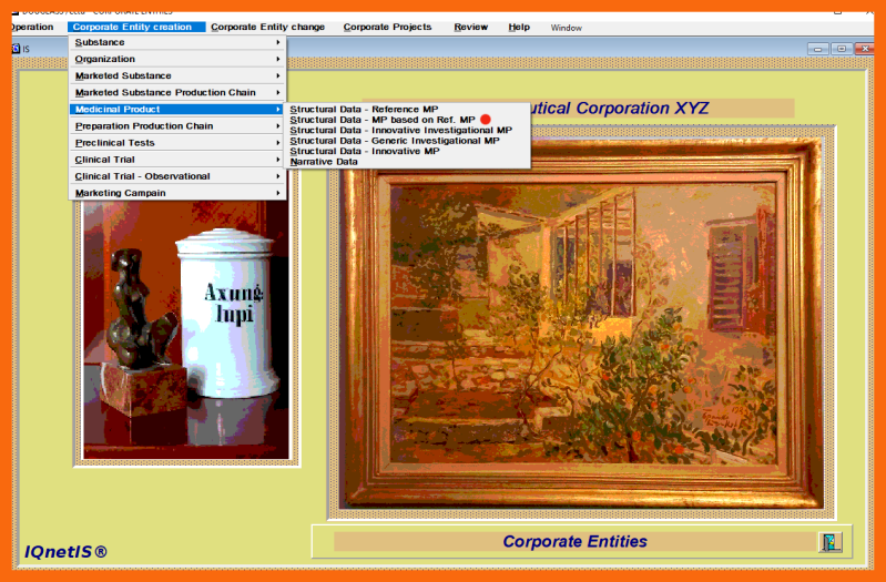 The process is initiated by choosing the menu item "Corporate Entity creation / Medicinal Product / Narrative Data" on the "Corporate Entities" application module.