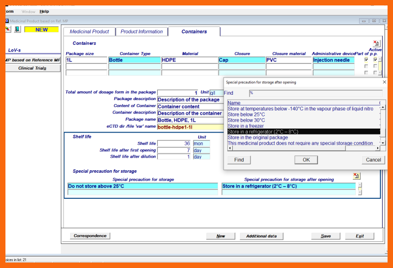 For a Medicinal Product, one or more Containers can be defined along with shelf life and storage conditions.